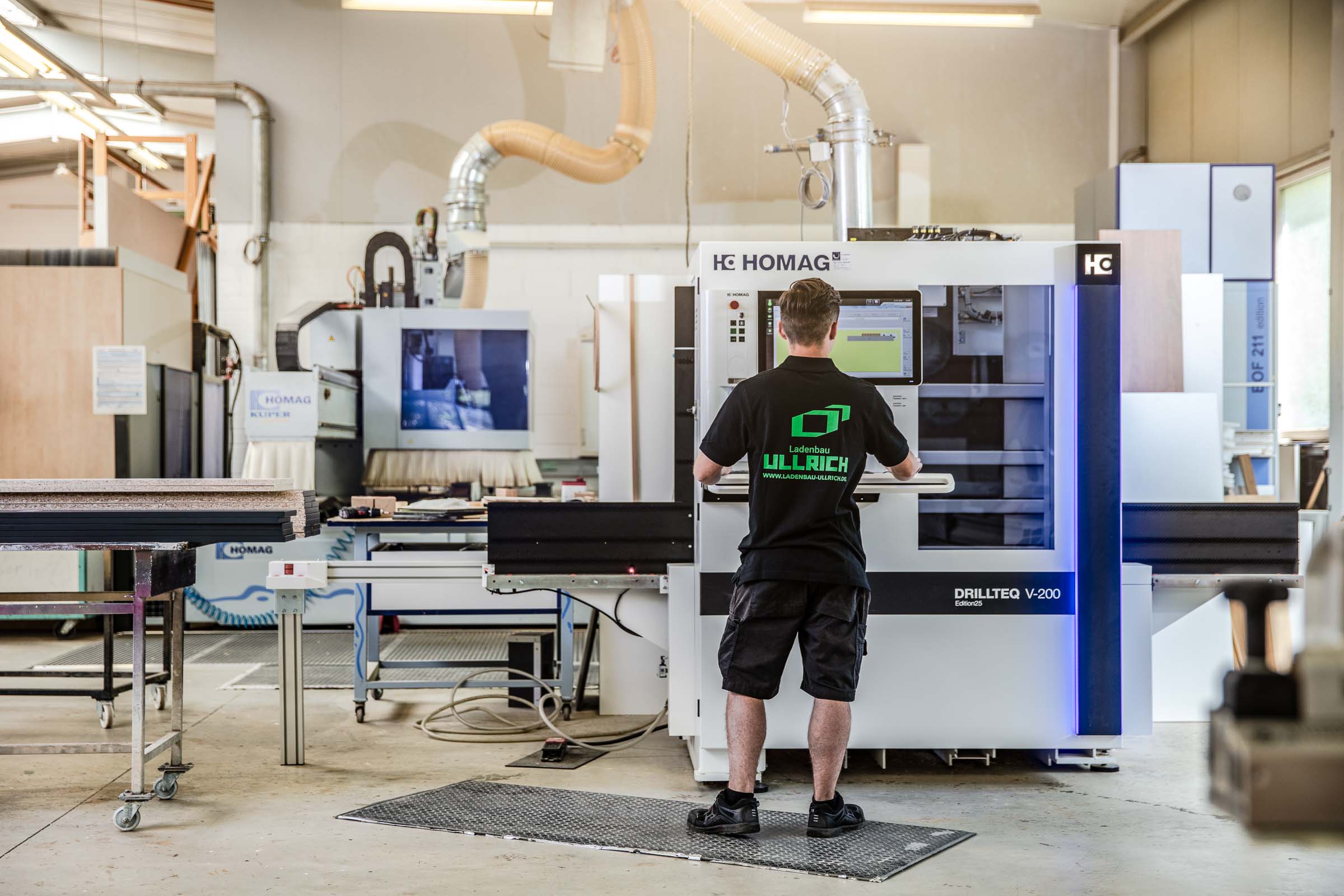 Moderne Optik, langlebiges Material und ergonomisches Design erfordern Zeit. Daher setzen wir auf technisch optimierte Fertigungsprozesse: Neben millimetergenauen CNC-Maschinen unterstützt uns ein automatisiertes Lagersystem bei der zügigen Fertigung Ihrer Ladeneinrichtung.